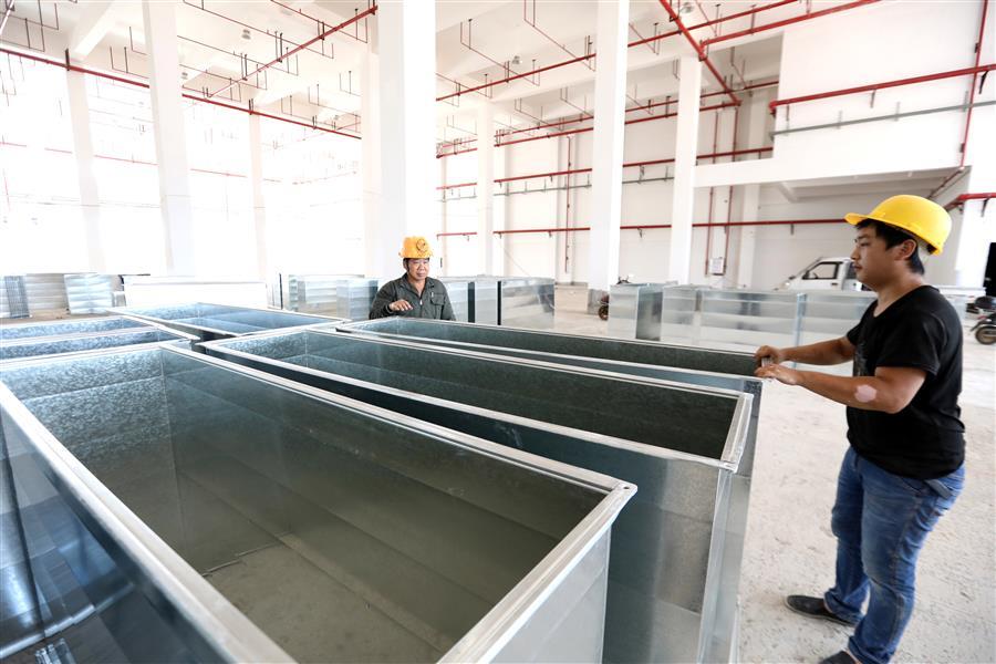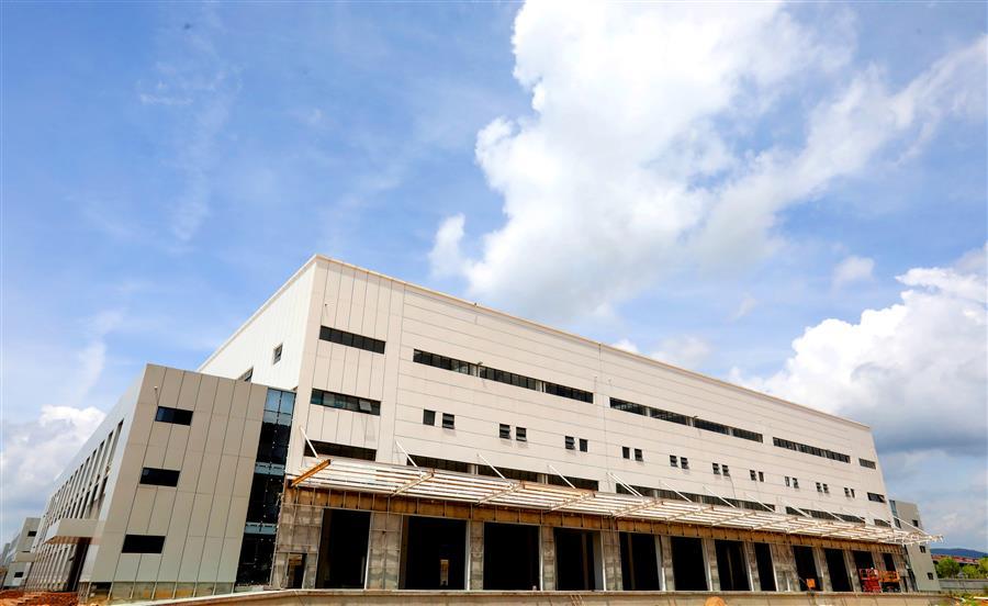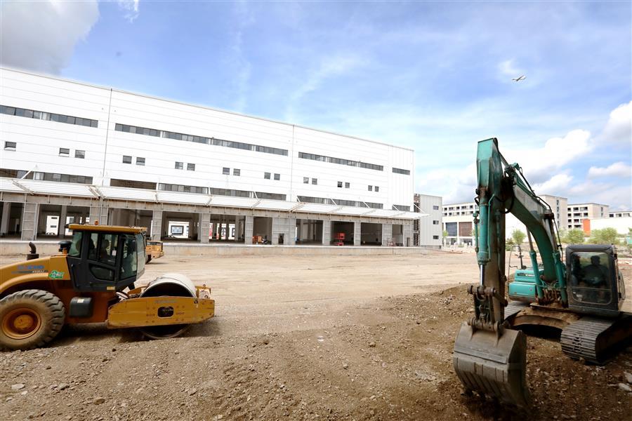 該項目負責人莫劍生介紹,倉儲配一體庫主要建設6棟庫房,目前項目主體基本建成,正緊張有序收尾。為了加快項目進度,項目部在做好防暑降溫、安全施工等保障措施的同時,采取多班組、多工種在不同的庫房交叉作業(yè),目前工地上有七八個班組在施工,施工內(nèi)容包括外立面、擋雨棚、通風管、地面硬化施工等。