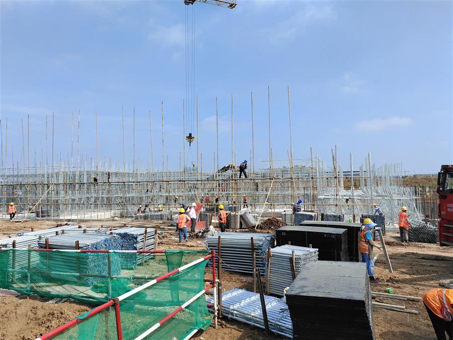 “日均投入施工技術(shù)人員500余人、各類機(jī)械設(shè)備45臺(tái)搶抓施工節(jié)點(diǎn)?!表?xiàng)目負(fù)責(zé)人禤旭云說(shuō),自6月開(kāi)工以來(lái),針對(duì)項(xiàng)目工期緊、任務(wù)重的情況,項(xiàng)目部按照“開(kāi)工即攻堅(jiān)、起步即沖刺”的要求,全面推進(jìn)項(xiàng)目建設(shè)。目前,中試車間基礎(chǔ)回填、褥墊層鋪筑、墊層澆筑、剛性地面鋼筋綁扎完成;1#生產(chǎn)車間53~56軸獨(dú)基開(kāi)挖基礎(chǔ)承臺(tái)鋼筋綁扎、模板安裝、砼澆筑完成,48~52軸基礎(chǔ)開(kāi)挖、墊層澆筑完成;2#生產(chǎn)車間18~25軸基礎(chǔ)承臺(tái)鋼筋綁扎、模板安裝、砼澆筑完成;倉(cāng)庫(kù)基礎(chǔ)梁全部完成。