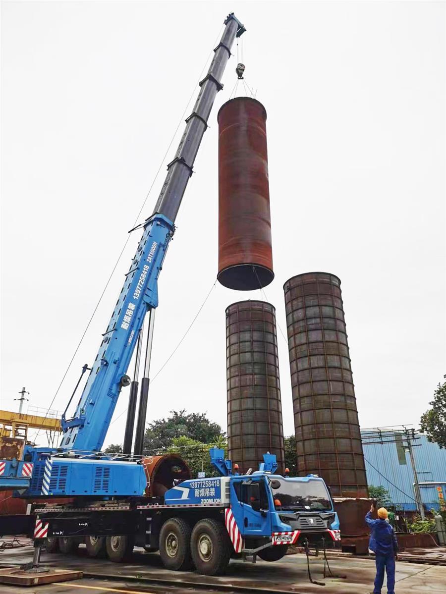 該工程共制作壓力容器設(shè)備4臺,其中空氣預(yù)冷系統(tǒng)空冷塔1臺,塔身直徑4.236米,塔高28.450米,塔重約71噸;水冷塔1臺,塔身直徑3.824米,塔高22.1米,塔重約38噸;分子篩吸附器2臺,塔身直徑4.236米,塔高18.120米,塔重約63噸。
