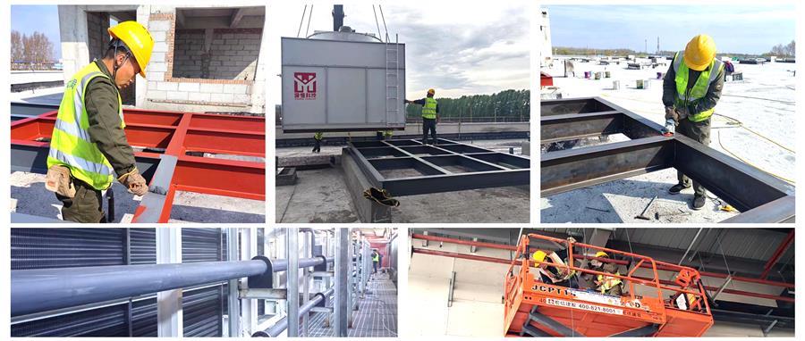 冷風機設(shè)備入場后,項目部立即有序開展焊接吊風機平臺工作,完成平臺焊接后,項目部合理安排進度計劃,實施進度管理。經(jīng)過項目部全體人員的連續(xù)奮戰(zhàn),項目4號庫12臺冷風機已順利安裝到位,管道安裝完成80%;1號庫完成4臺蒸發(fā)式冷凝器安裝工作,下一步進行管道安裝。