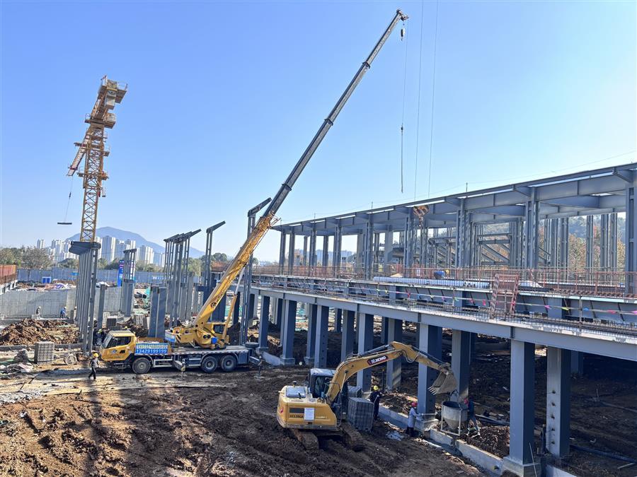 項目施工現(xiàn)場,機(jī)器轟鳴,工程車輛來回穿梭,工人們在各點位開展墊層、樓承板澆筑、鋼筋綁扎、栓釘焊接、基礎(chǔ)砌磚、屋面底板和鋼結(jié)構(gòu)梁柱安裝等施工作業(yè),處處涌現(xiàn)“冬忙”景象。