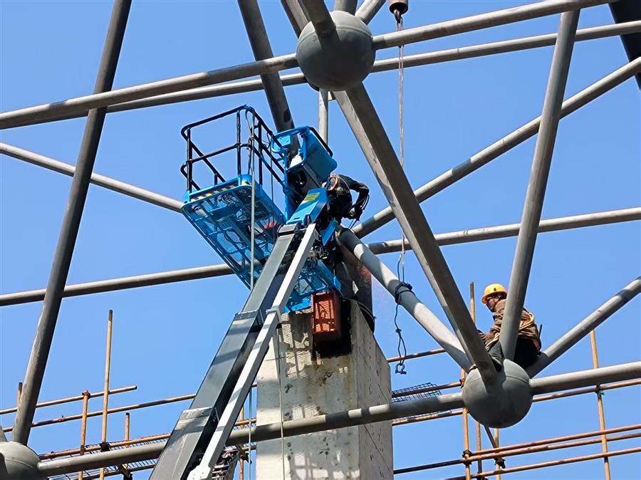 項(xiàng)目部嚴(yán)格落實(shí)好節(jié)后復(fù)工復(fù)產(chǎn)“六個(gè)一”,全面排查網(wǎng)架班組施工安全隱患,對施工設(shè)備、作業(yè)人員、安全防護(hù)設(shè)施等進(jìn)行檢查和培訓(xùn),確保設(shè)備設(shè)施安全可靠后全面復(fù)工。目前,該項(xiàng)目正在進(jìn)行網(wǎng)架小立柱的安裝和提升架的拆除工作。