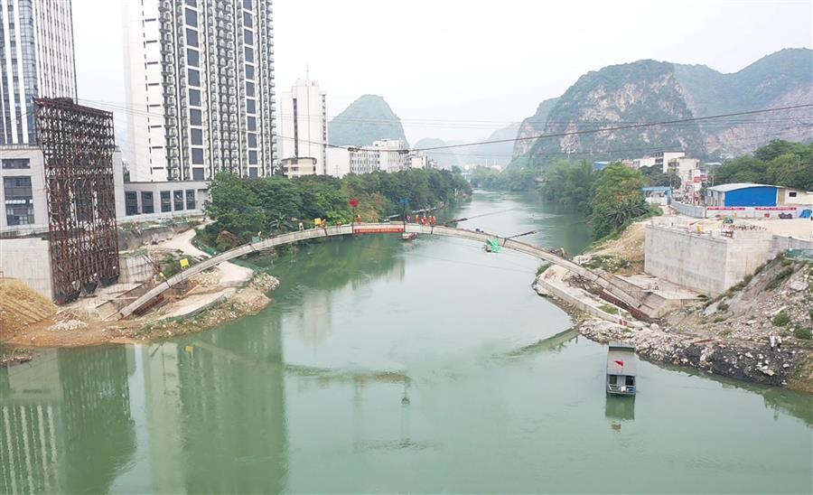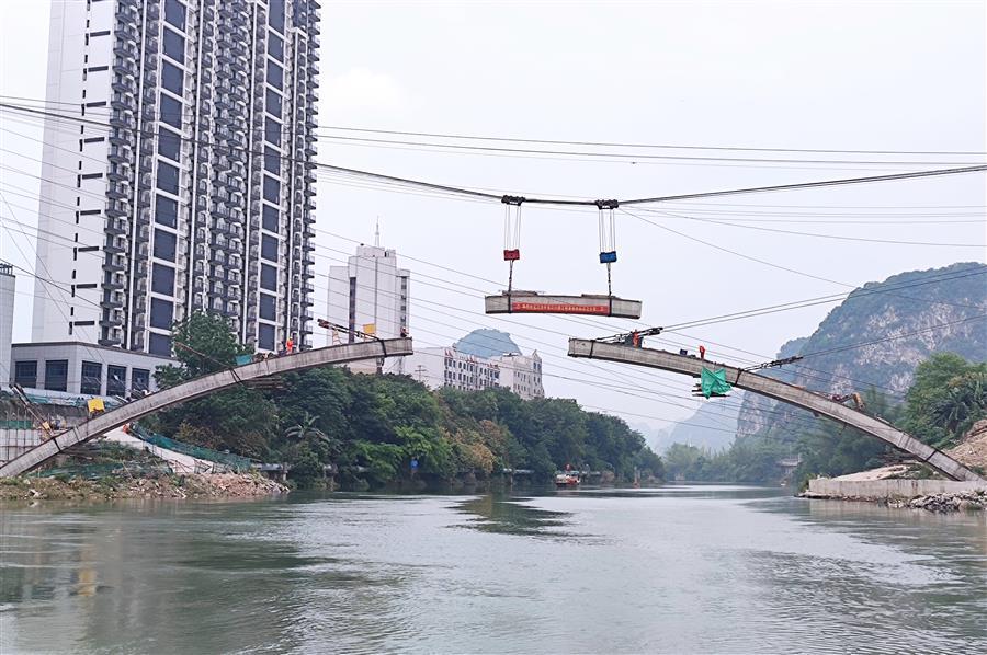 8:28分,隨著現(xiàn)場(chǎng)指揮員一聲口令,首條拱肋最后一節(jié)砼拱箱被纜索吊緩緩吊起,向橫跨在龍江河上的主拱圈移動(dòng)。25分鐘后,第七片拱箱精準(zhǔn)吊裝就位,河池市龍江六橋(輝樂橋)首條拱肋順利合攏。