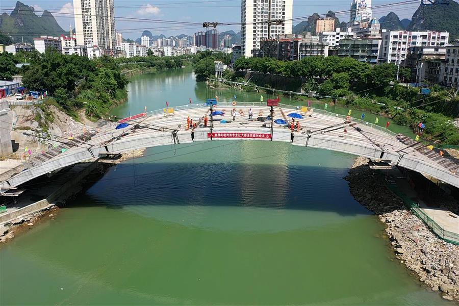 8月3日,隨著最后一節(jié)(第98節(jié))砼拱箱精準(zhǔn)吊裝至預(yù)定位置,標(biāo)志著冶建公司桂金分公司承建的河池市龍江六橋(輝樂橋)順利實現(xiàn)主拱圈全面合龍。公司黨委副書記、紀(jì)委書記、工會主席賴海標(biāo)到現(xiàn)場指導(dǎo)。