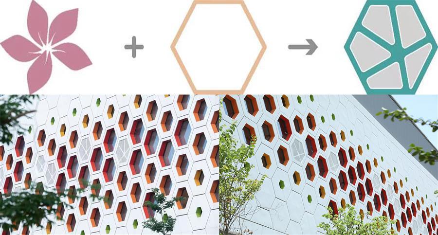 項目整體采用去工業(yè)化設(shè)計,將紫荊花與蜂巢的意象同時融入建筑立面,形成“蜂棲紫荊”的寓意;其中紫荊花代表柳州,而蜂巢之中花粉釀蜜的過程,又與垃圾焚燒發(fā)電的工藝流程形成隱喻。