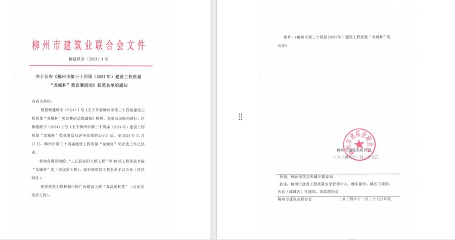 11月28日,柳州市建筑業(yè)聯(lián)合會公布柳州市第三十四屆(2024年)建設工程質(zhì)量“龍城杯獎”競賽活動獲獎名單和2024年柳州市建設工程優(yōu)質(zhì)結(jié)構(gòu)獎名單,由冶建公司承建的三江縣宜陽大橋工程等4項工程榮獲“龍城杯”獎;柳州市柳東新區(qū)明德小學項目(一期)等2項工程獲柳州市“優(yōu)質(zhì)結(jié)構(gòu)獎”。