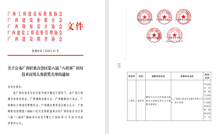 近日,廣西第八屆“八桂杯”BIM技術(shù)應(yīng)用大賽獲獎(jiǎng)名單公布,冶建公司基礎(chǔ)分公司申報(bào)的《BIM 技術(shù)應(yīng)用護(hù)航融安融洲幼兒園建設(shè)項(xiàng)目全過(guò)程高質(zhì)量建設(shè)》榮獲施工組建筑類二等獎(jiǎng)。