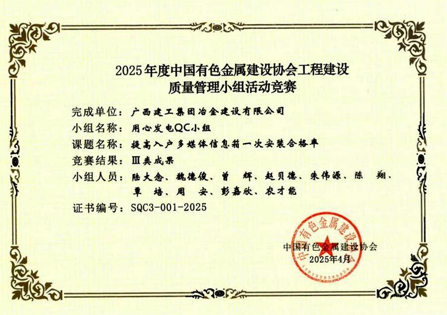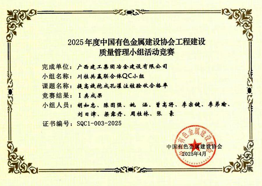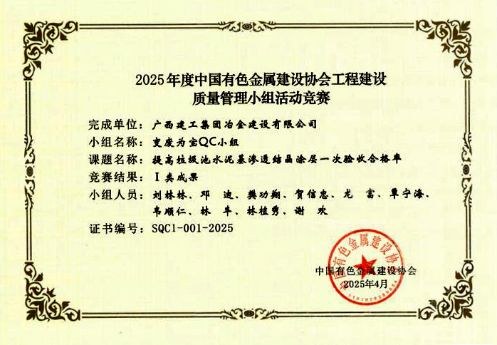 近日,中國(guó)有色金屬建設(shè)協(xié)會(huì)公布2025年度中國(guó)有色金屬協(xié)會(huì)工程建設(shè)質(zhì)量管理小組活動(dòng)競(jìng)賽結(jié)果,冶建公司申報(bào)的4項(xiàng)成果中,有三項(xiàng)獲得Ⅰ類成果,一項(xiàng)獲得Ⅲ類成果。公司此次申報(bào)獲獎(jiǎng)率100%。