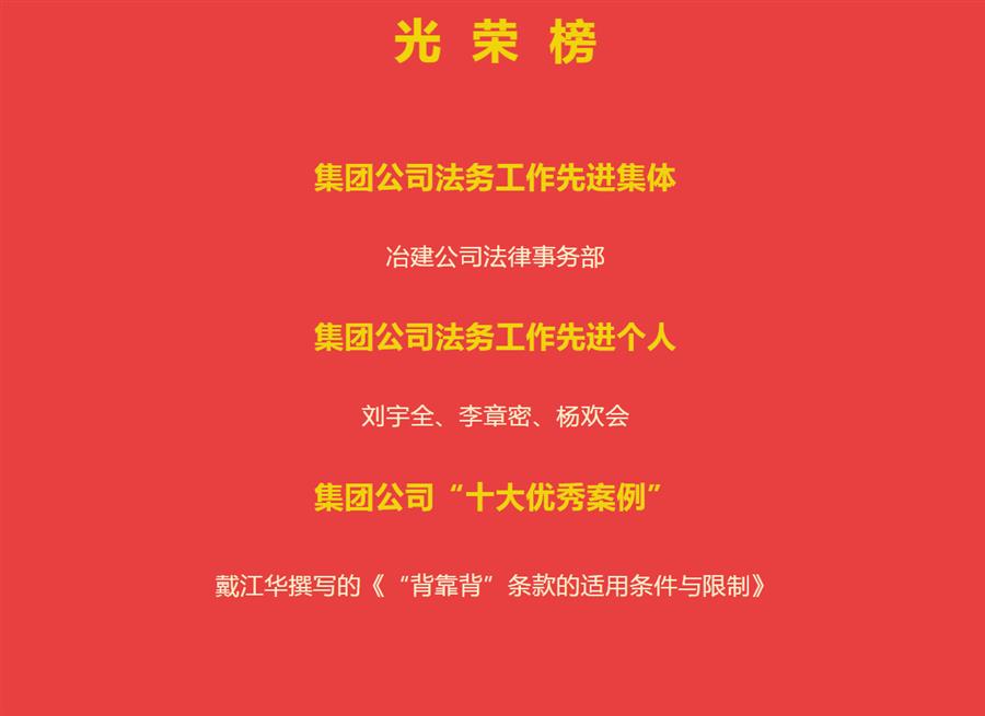 這些榮譽(yù)的取得,是全體法務(wù)人員辛勤努力的結(jié)果,更是公司整體實(shí)力的體現(xiàn)。冶建公司法律事務(wù)部將繼續(xù)為公司平穩(wěn)發(fā)展拼搏奮進(jìn),努力為公司實(shí)現(xiàn)恢復(fù)性增長(zhǎng)作出新的貢獻(xiàn)!
